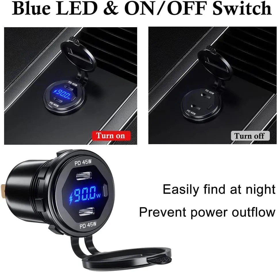 Fast Charging: Type C USB C PD 45W + 45W fast charging technology brings you a high speed charging experience in a short driving time,with power switch,turn ON/OFF USB C Type C output,switch can not turn off the voltmeter.
